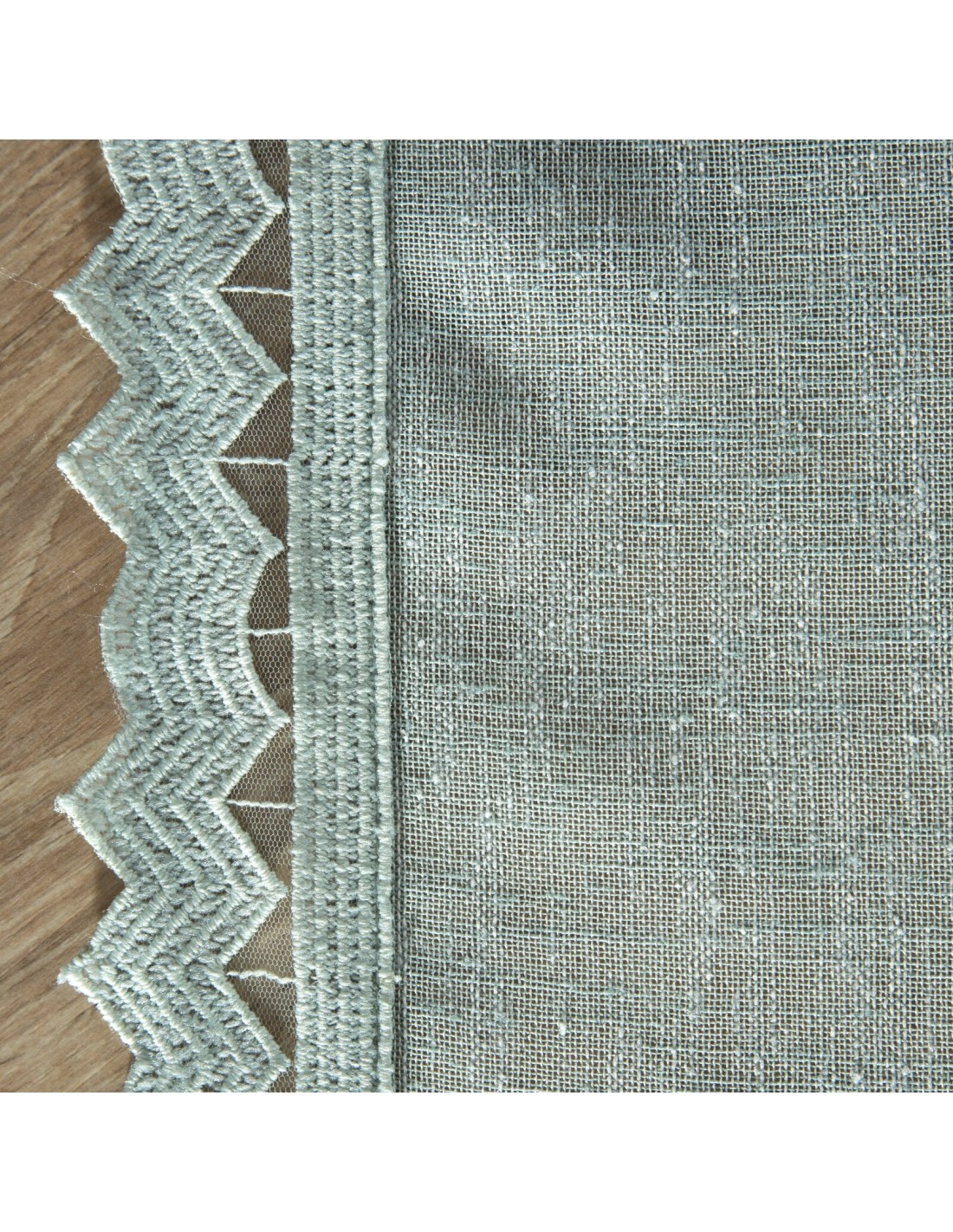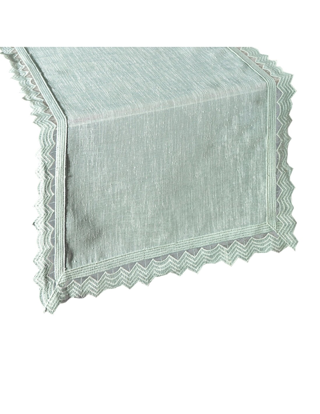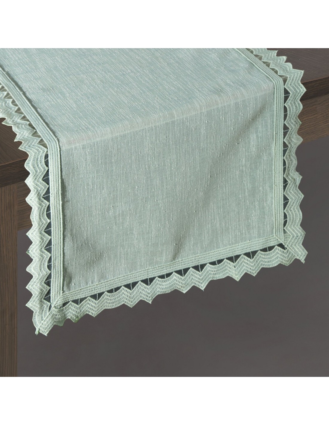 Ekskluzywny obrus z kolekcji premium z tkaniny o strukturze płótna wykończona na brzegach klasyczną koronką. Łatwy w prasowaniu, uniwersalny klasyczny chatakter szerokość: 35 cm, długość: 180 cm, kolor: miętowy, Gramatura: 200 GSM, Skład: 100% poliester