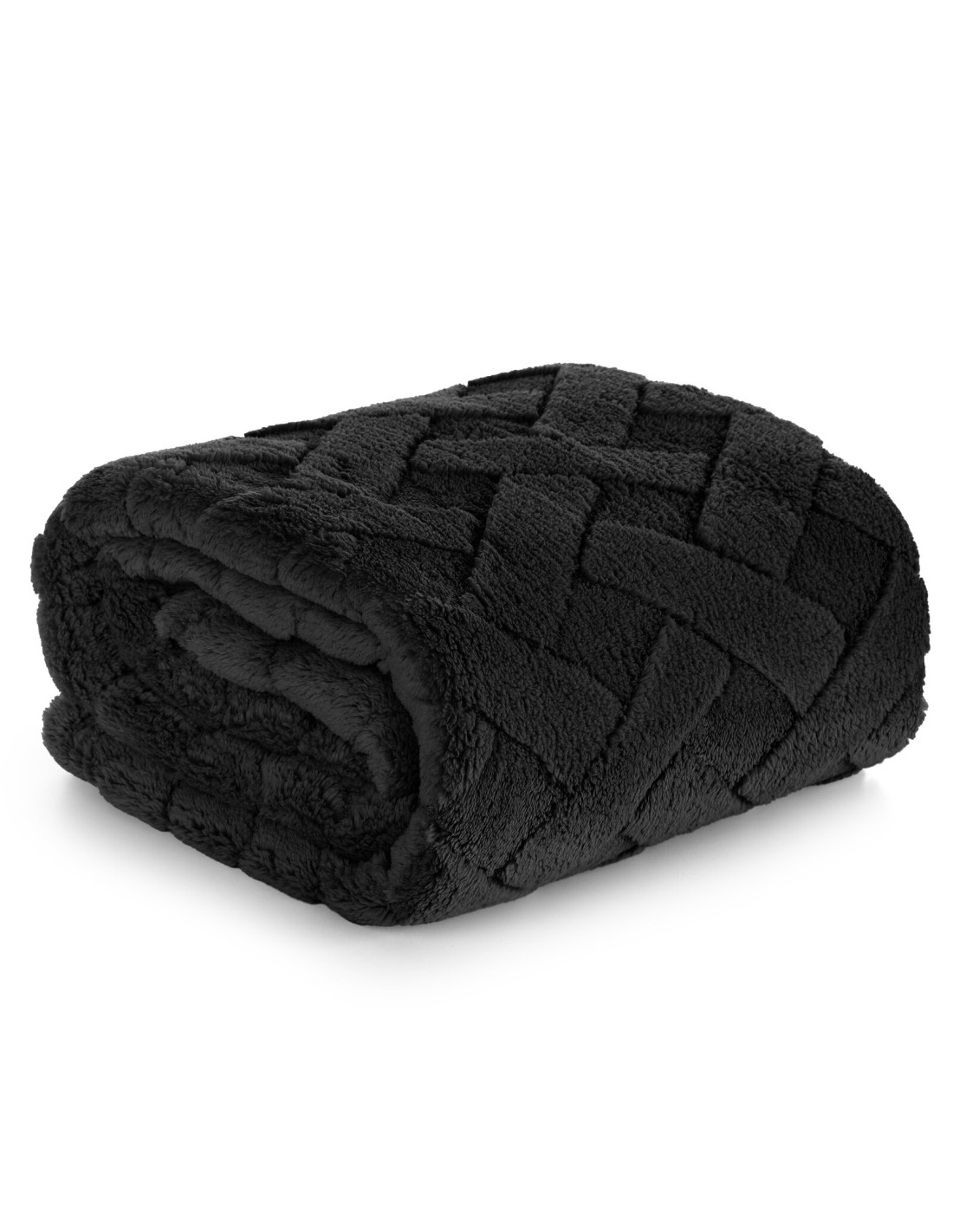 Klasyczny koc z przyjemnego w dotyku włókna w technologii mikroflano. Jednobarwna, puszysta faktura ozdobiona jest minimalistycznym tłoczeniem w formie jodełki. szerokość: 70 cm, długość: 160 cm, kolor: czarny, Gramatura: 340 GSM, Skład: 100% poliester