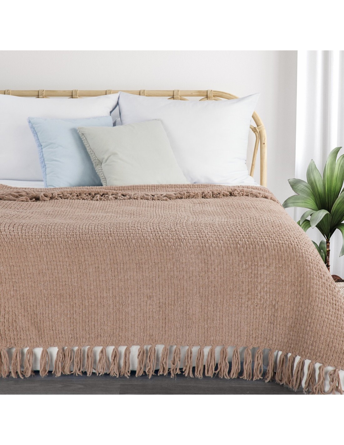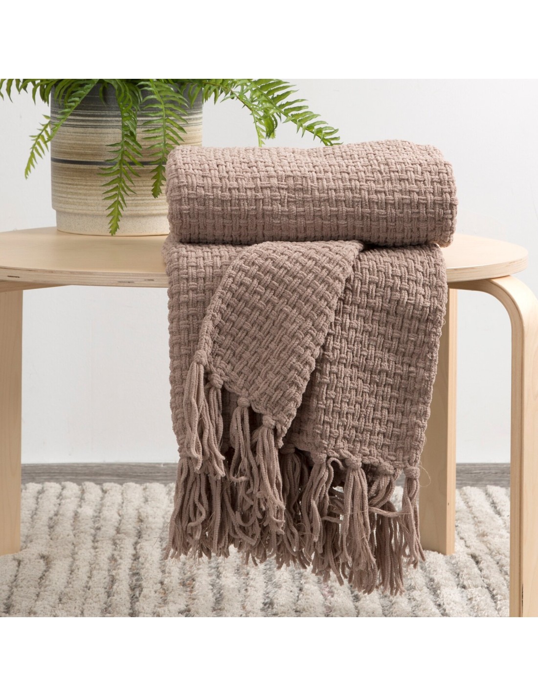 Tkany koc z frędzlami szerokość: 130 cm, długość: 170 cm, kolor: ciemnobeżowy, Gramatura: 380 GSM, Skład: 100% poliester
