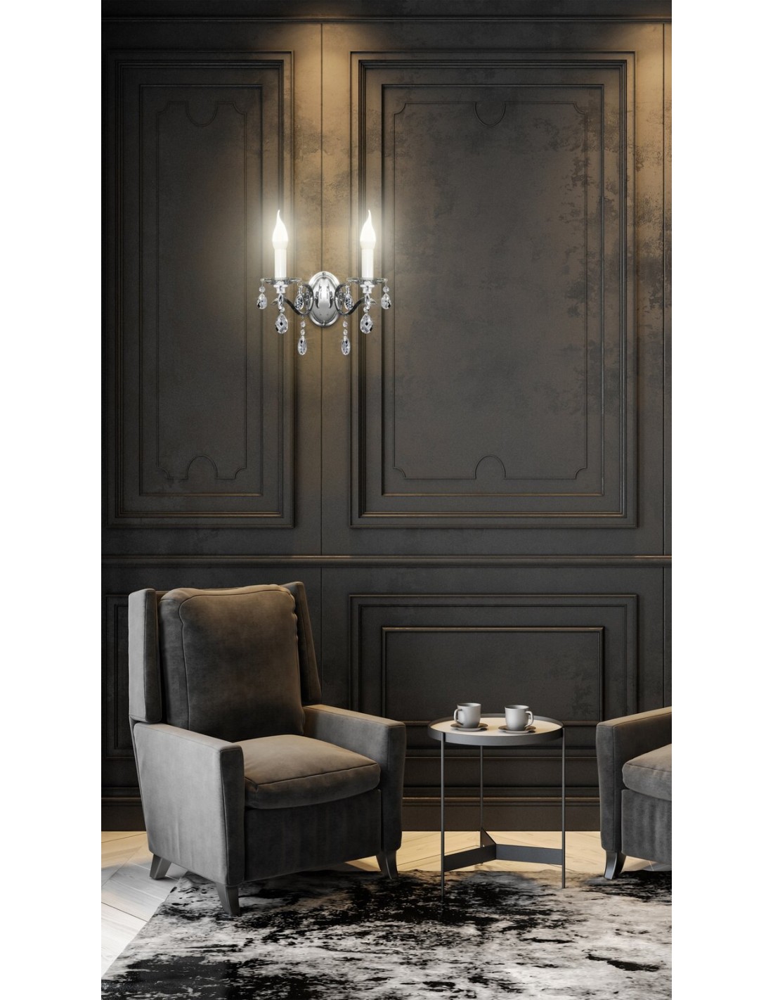 Kinkiet dekoracyjny szerokość: 34 cm, długość: 20 cm, kolor: srebrny, Skład: metal, chrom, kryształ k9 , Zasilanie: CE 220-240V , Żarowka: 2 X E14 40W , Klasa energetyczna: A-G