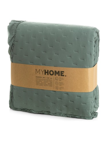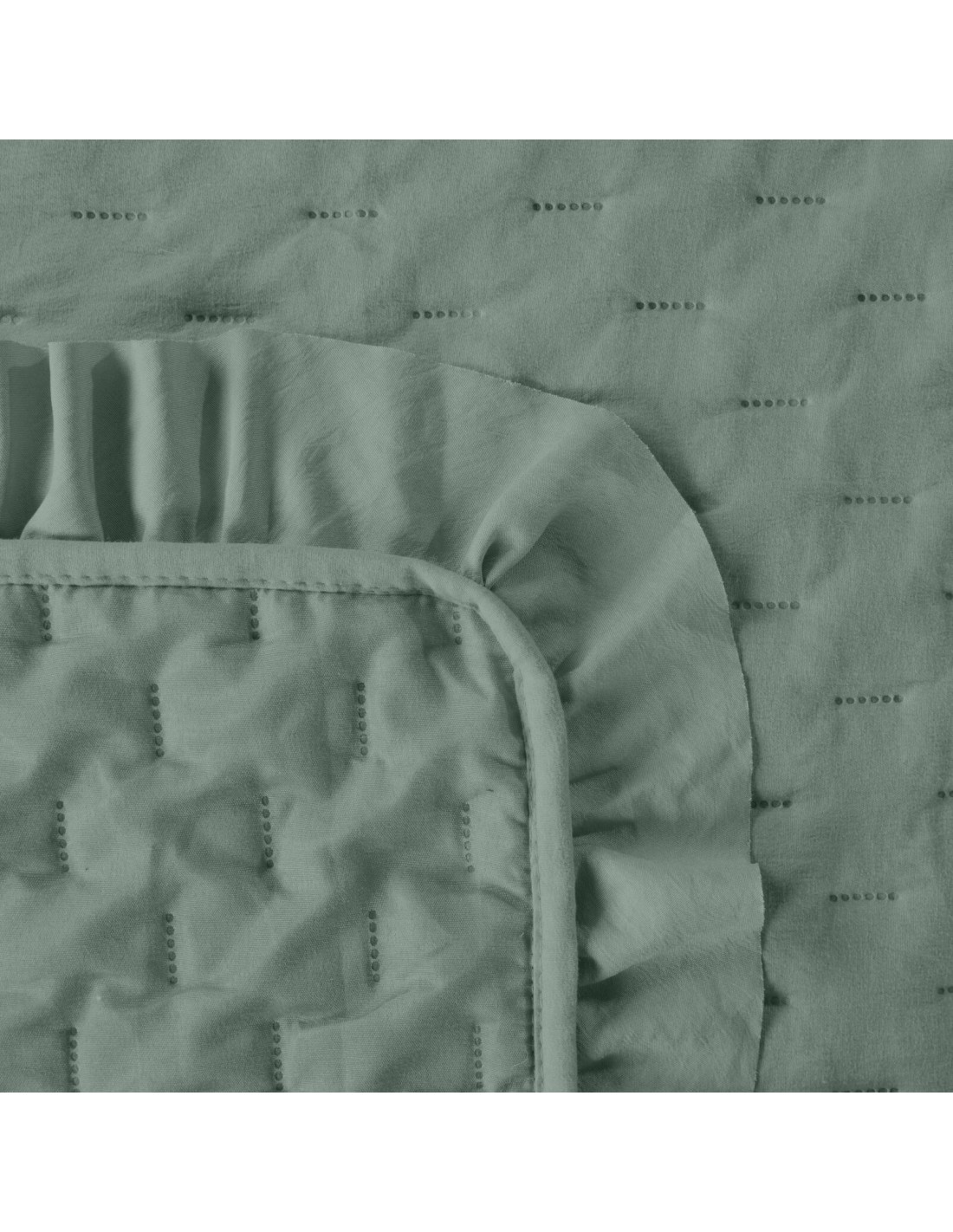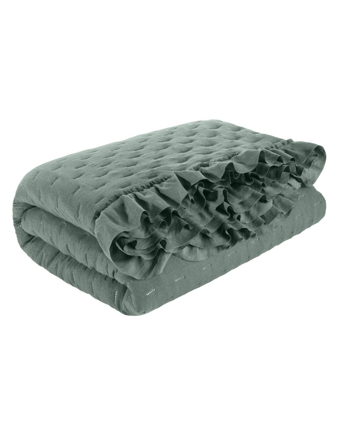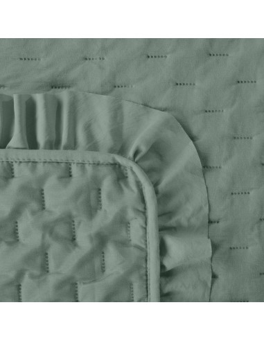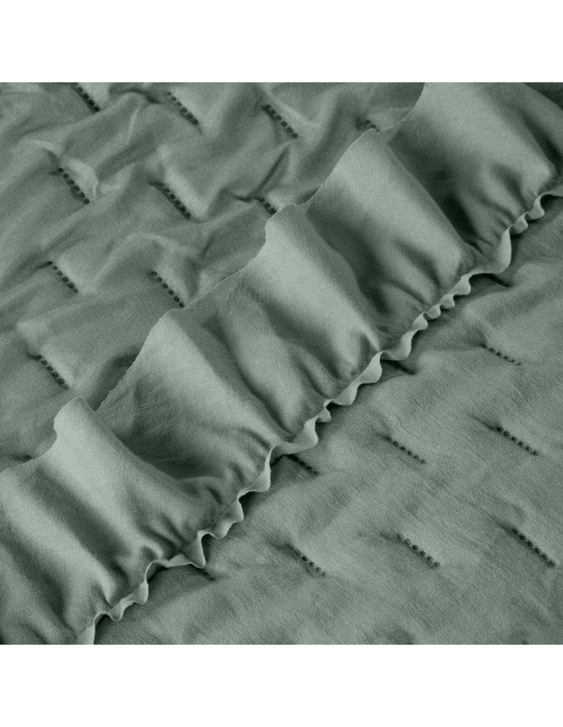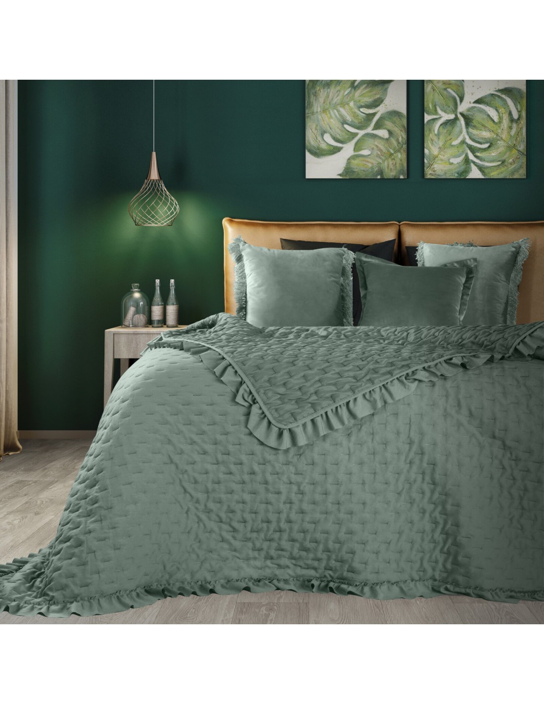Narzuta jednokolorowa wykonana techniką hot press, obszyta falbaną szerokość: 220 cm, długość: 240 cm, kolor: ciemnomiętowy, Gramatura: 80+70+120 GSM, Skład: 100% poliester
