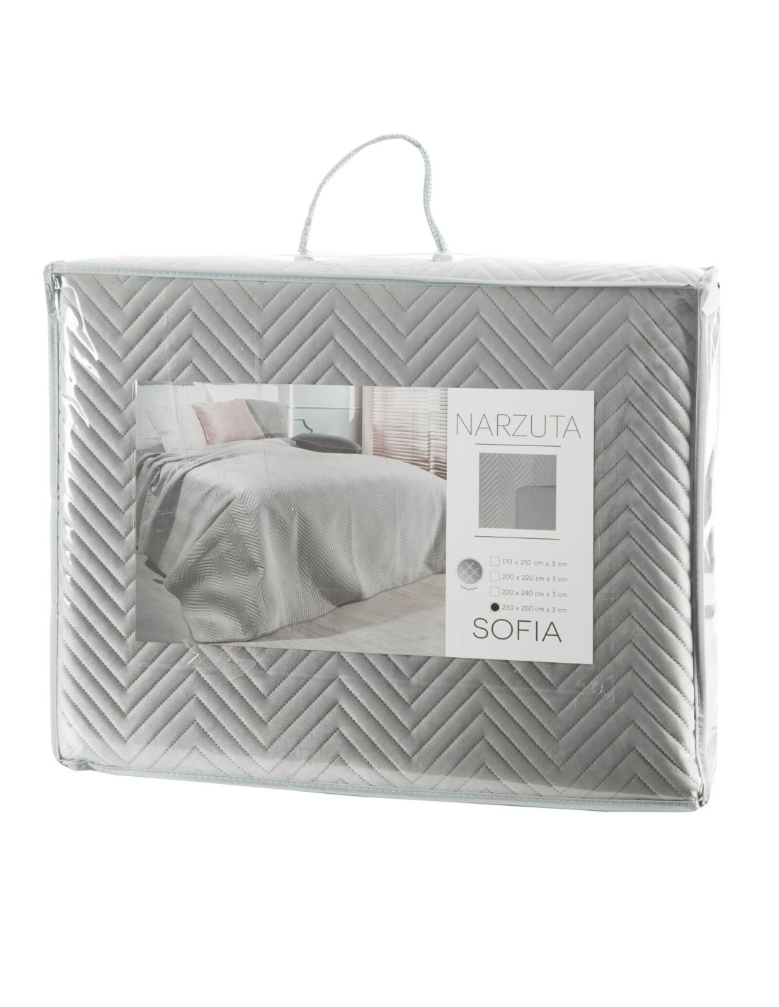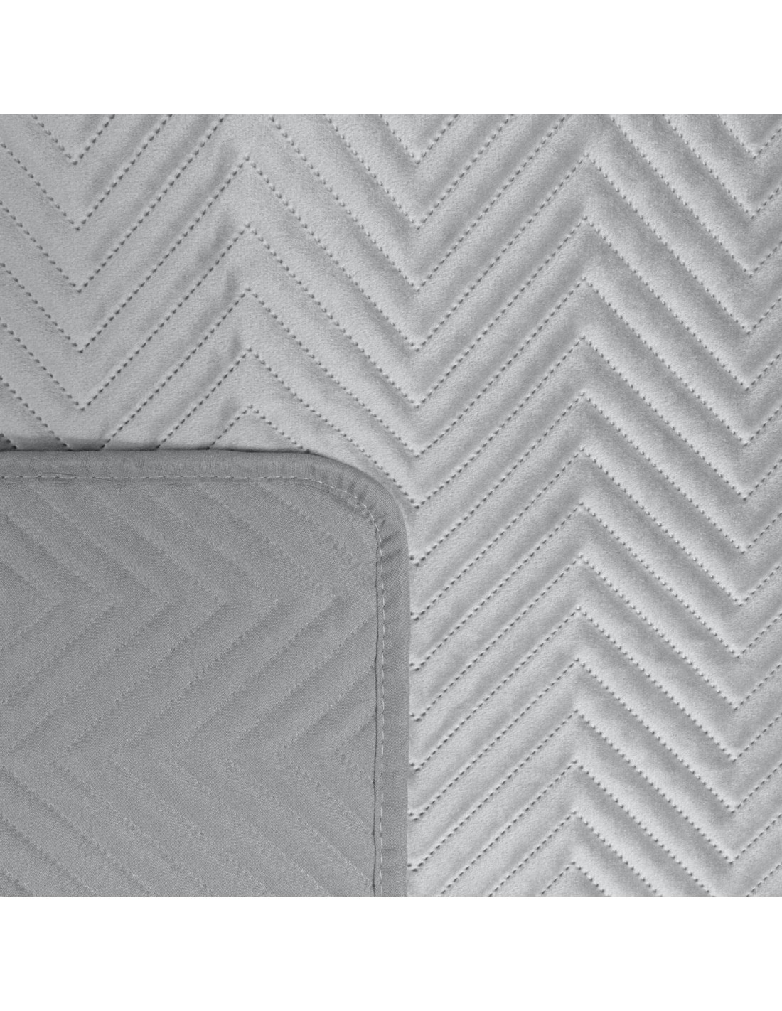 Ekskluzywna narzuta na łóżko z miękkiego i przyjemnego w dotyku welwetu pikowanego w dużą, gęstą jodełką. Do pikowania wykorzystano metodę bezszwową hotpress. szerokość: 200 cm, długość: 220 cm, kolor: srebrny, Gramatura: 250+120+65 GSM, Skład: 100% poliester