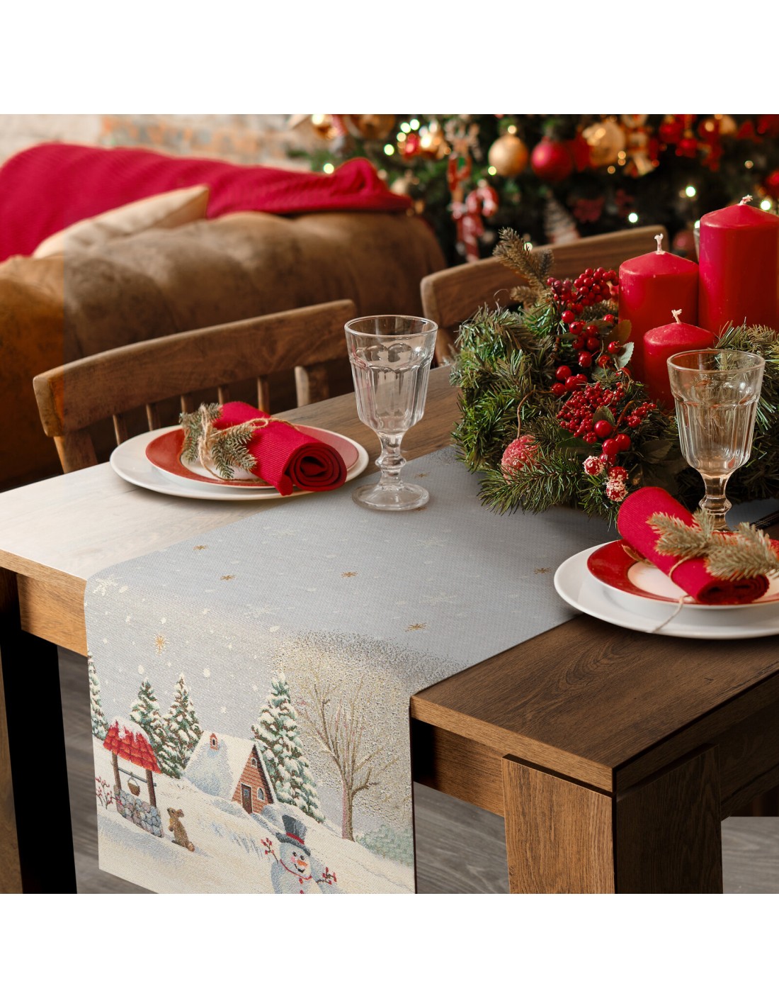 Obrus gobelinowy ze świątecznym wzorem szerokość: 45 cm, długość: 140 cm, kolor: popielaty, Gramatura: 410 GSM, Skład: 53% poliester, 40% bawełna, 4% nić metaliczna, 3% akryl