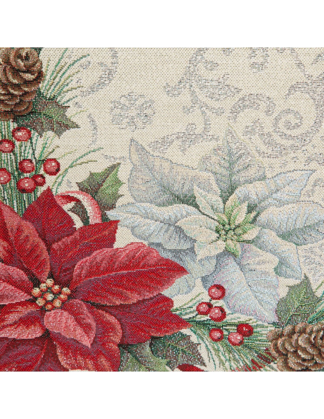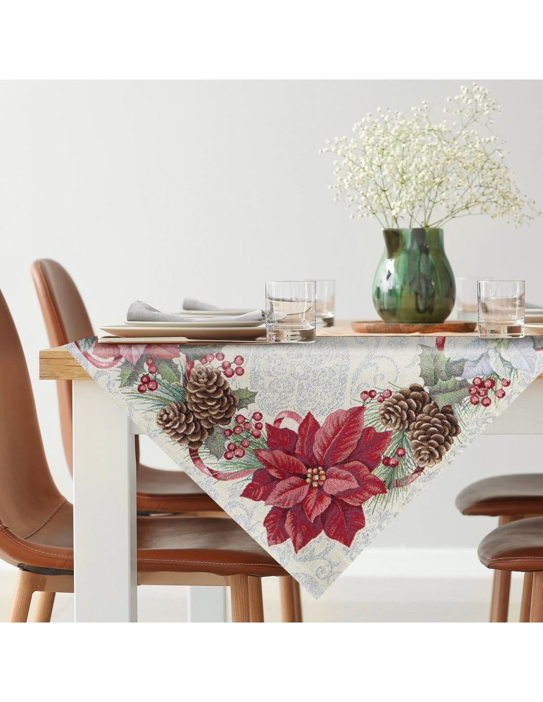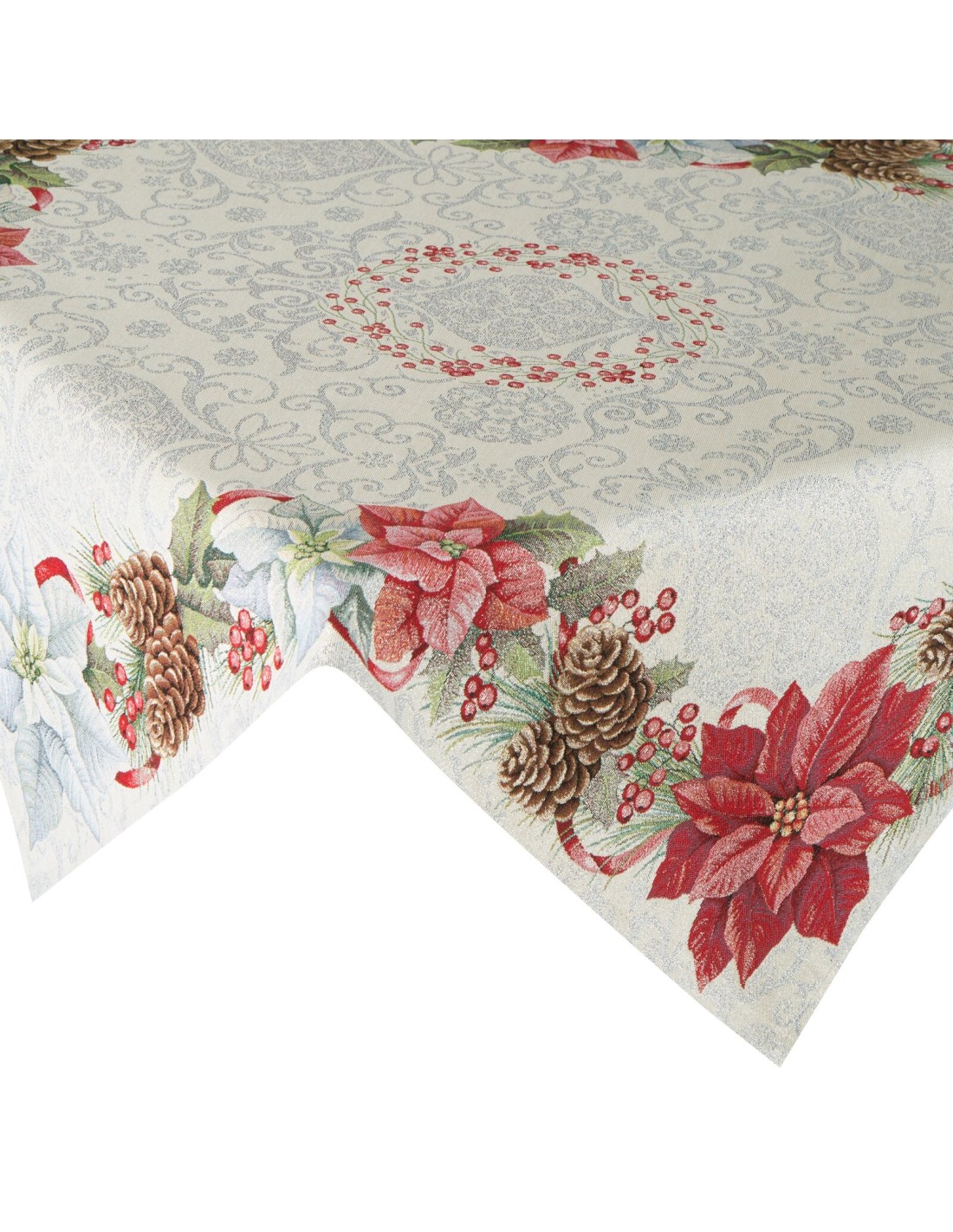 Obrus gobelinowy z nicią metaliczną szerokość: 100 cm, długość: 100 cm, kolor: srebrzysty, Gramatura: 315 GSM, Skład: 53% poliester, 40% bawełna, 4% nić metaliczna, 3% akryl