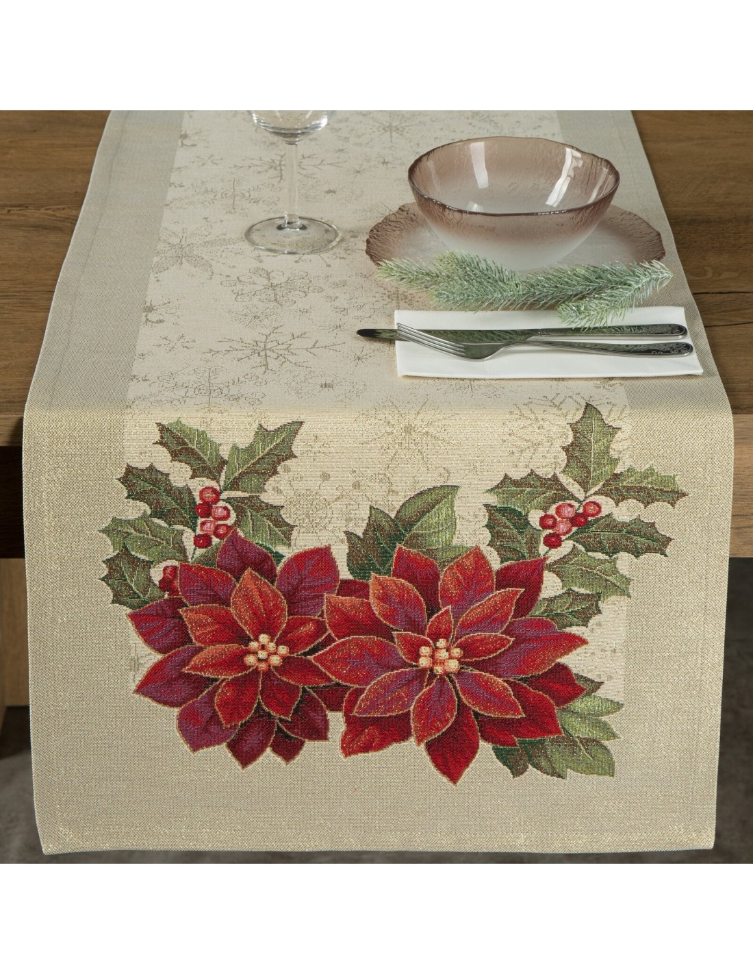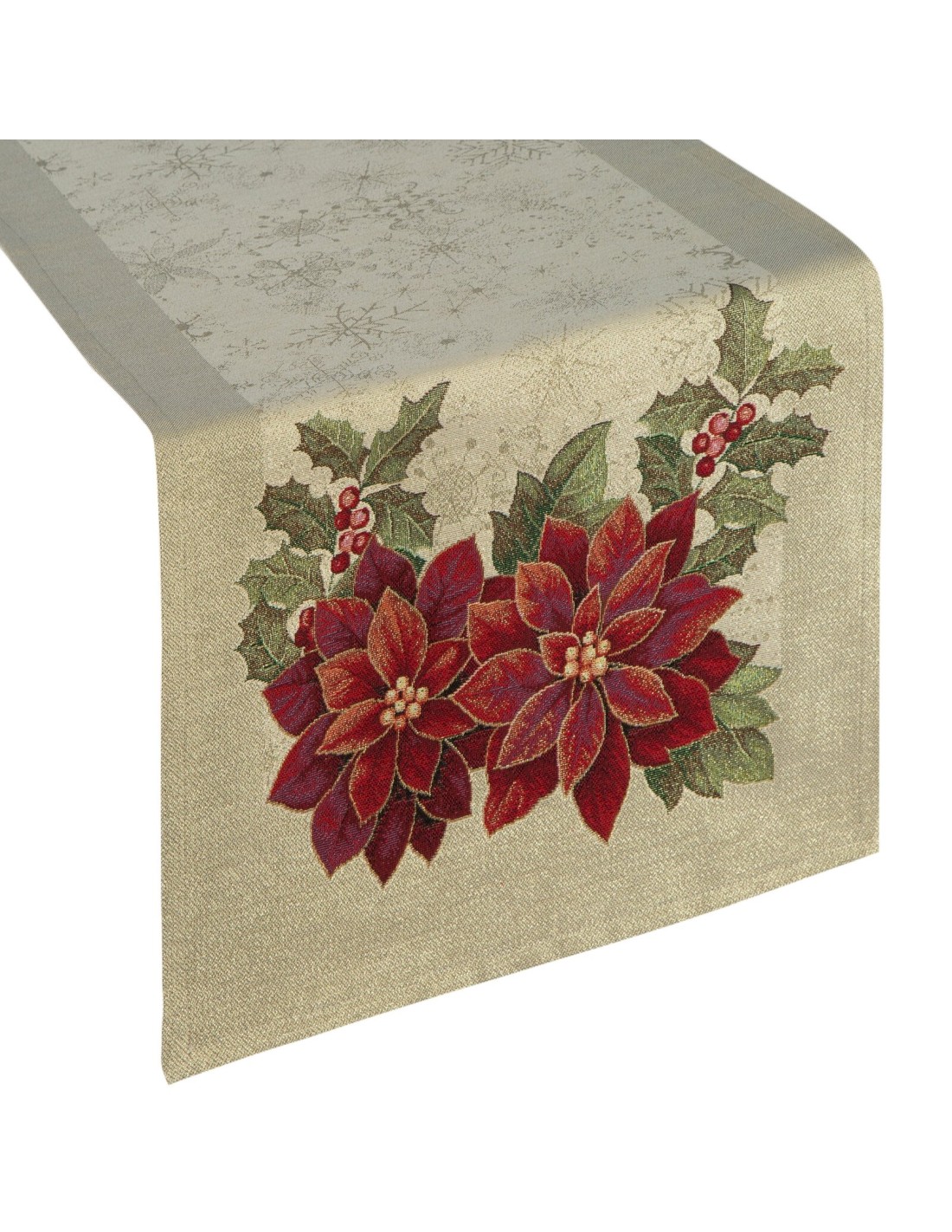 Obrus gobelinowy ze świątecznym wzorem szerokość: 50 cm, długość: 110 cm, kolor: złoty, Gramatura: 315 GSM, Skład: 53% poliester, 40% bawełna, 4% nić metaliczna, 3% akryl