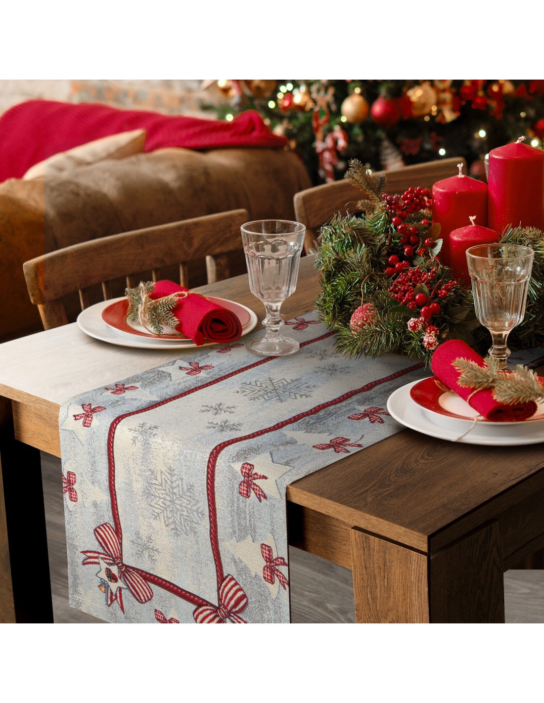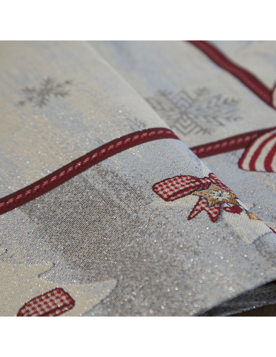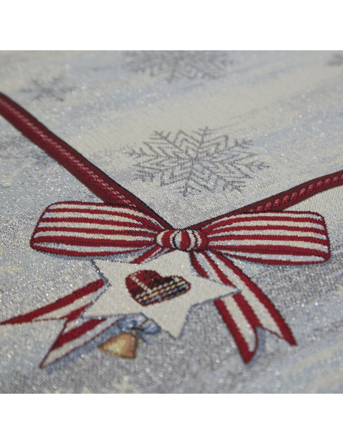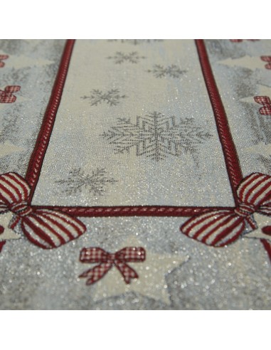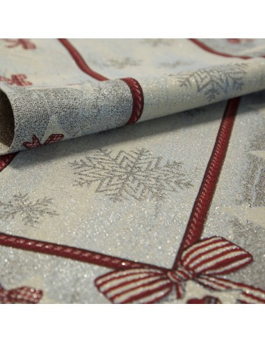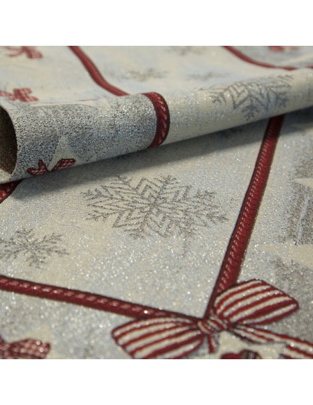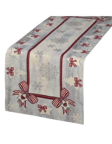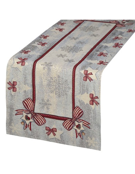 Obrus gobelinowy ze świątecznym wzorem szerokość: 45 cm, długość: 140 cm, kolor: popielaty, Gramatura: 410 GSM, Skład: 53% poliester, 40% bawełna, 4% nić metaliczna, 3% akryl