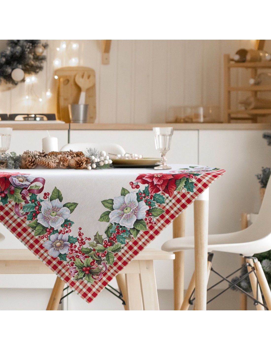 Obrus gobelinowy ze świątecznym wzorem szerokość: 140 cm, długość: 180 cm, kolor: naturalny, Skład: 63% poliester, 34% bawełna, 3% akryl