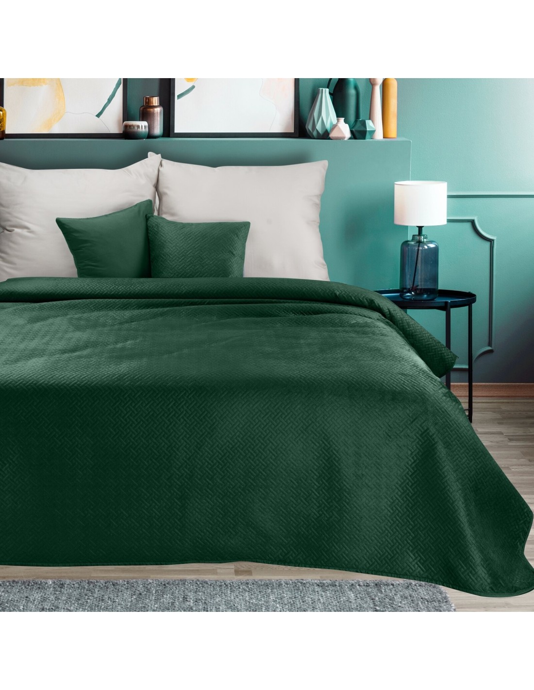 Narzuta welurowa,wykonana metodą hot press szerokość: 200 cm, długość: 220 cm, kolor: zielony, Gramatura: 150+100+65 GSM, Skład: 100% poliester