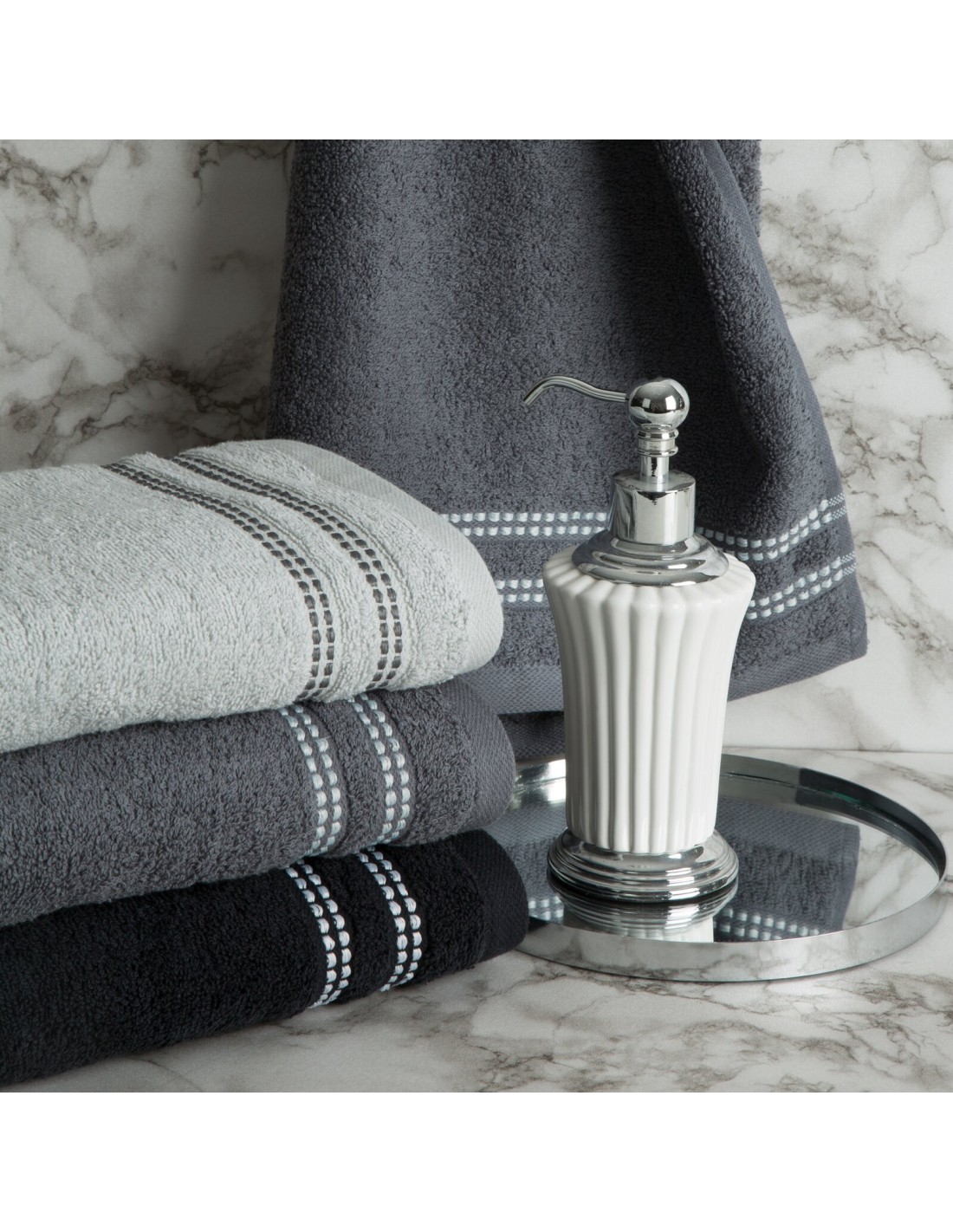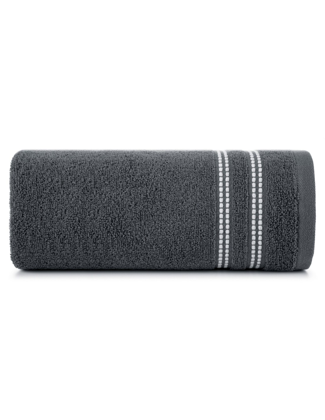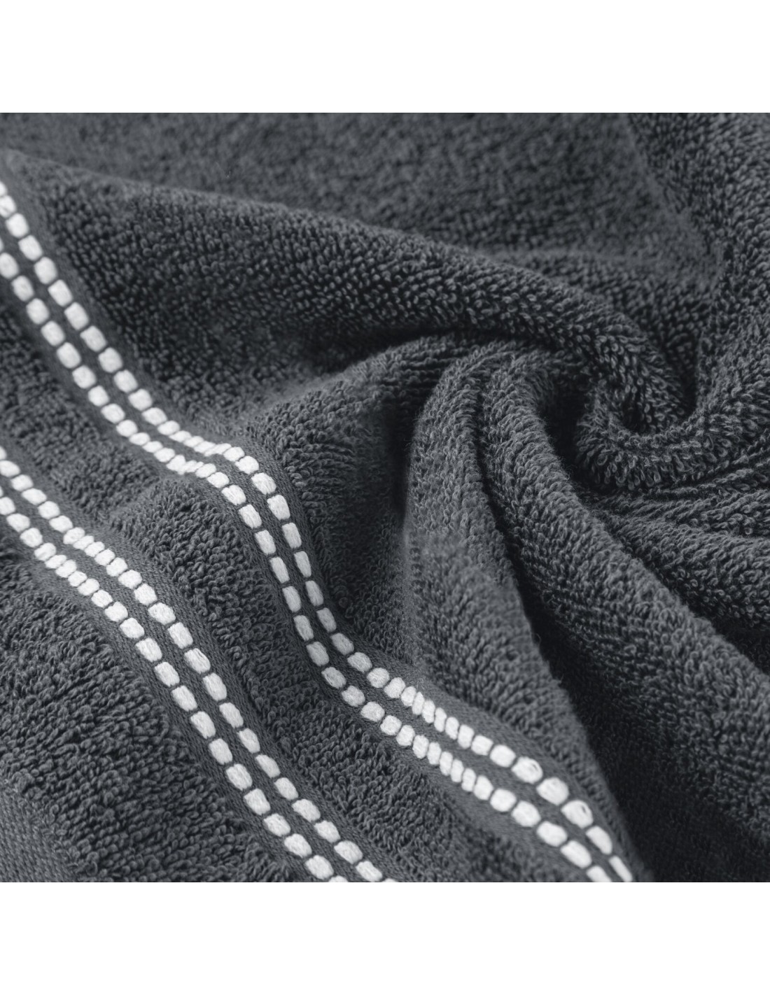 Klasyczny ręcznik kąpielowy z chłonnej tkaniny bawełnianej o splocie frotte. Minimalistyczna bordiura z weluru z dodatkiem lśniącej, metalicznej nici. szerokość: 50 cm, długość: 90 cm, kolor: grafitowy, Gramatura: 500 GSM, Skład: 100% bawełna; część ozdobna: 96% bawełna, 4% poliester