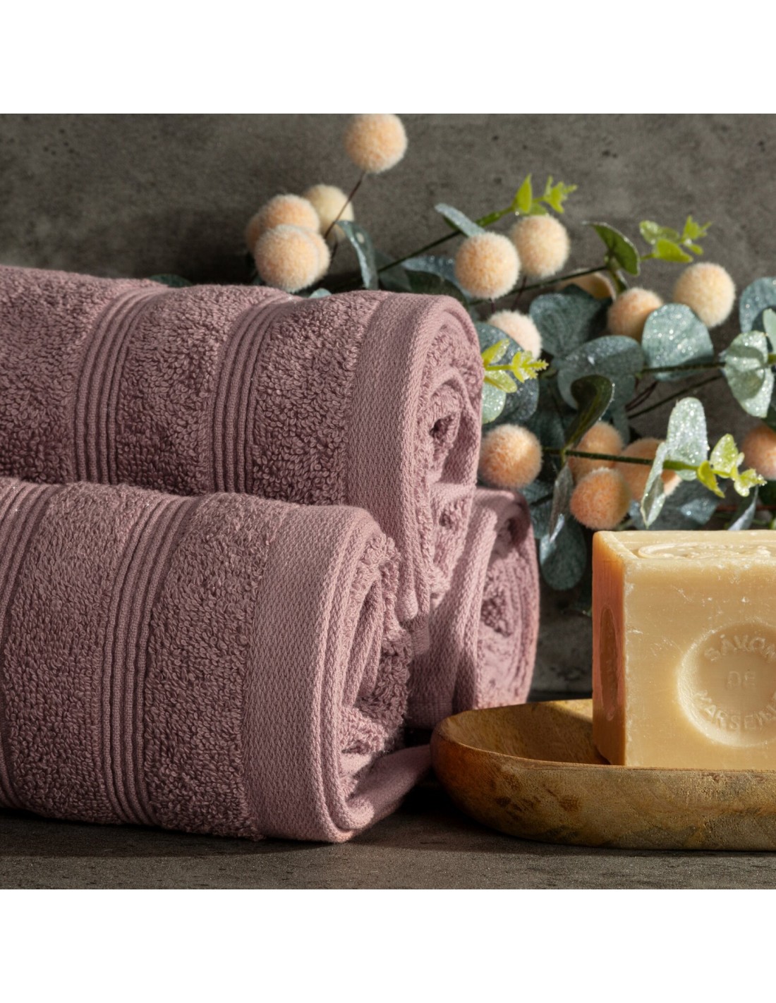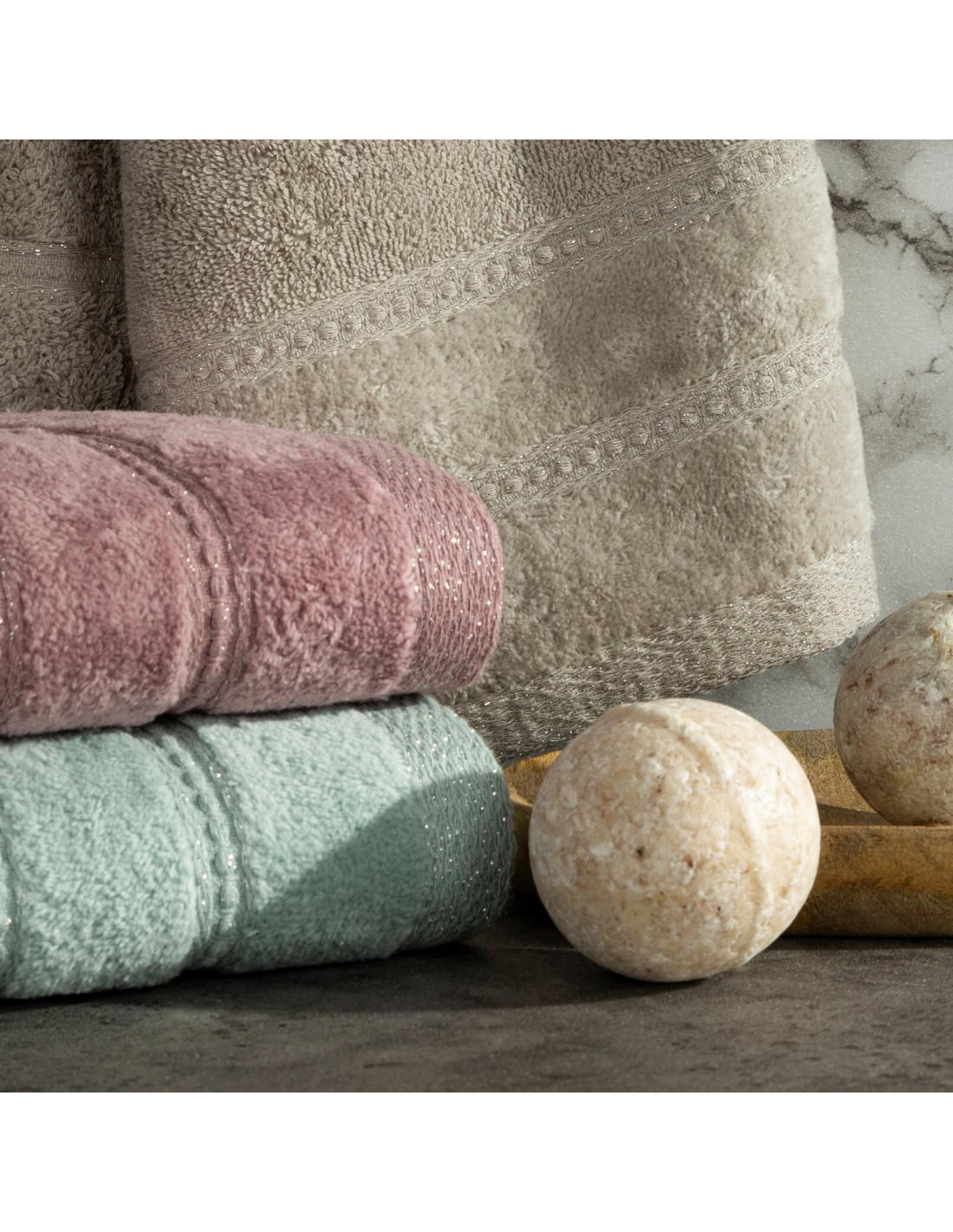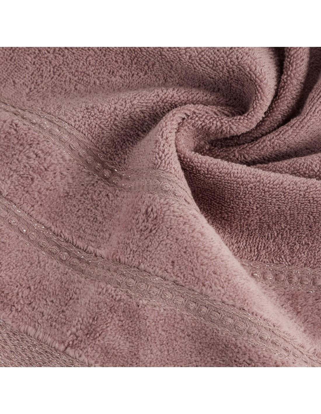 Klasyczny ręcznik kąpielowy z chłonnej tkaniny bawełnianej o splocie frotte. Minimalistyczna bordiura z weluru z dodatkiem lśniącej, metalicznej nici. szerokość: 70 cm, długość: 140 cm, kolor: liliowy, Gramatura: 500 GSM, Skład: 100% bawełna, 99.6% bawełna, 0.4% nić metaliczna