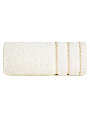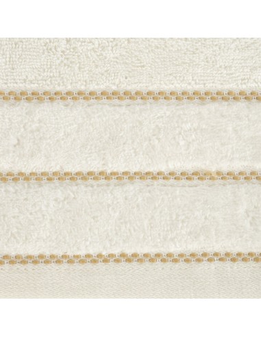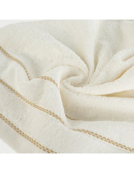 Klasyczny ręcznik kąpielowy z chłonnej tkaniny bawełnianej o splocie frotte. Minimalistyczna bordiura z weluru z dodatkiem lśniącej, metalicznej nici. szerokość: 30 cm, długość: 50 cm, kolor: kremowy, Gramatura: 500 GSM, Skład: 100% bawełna; część ozdobna: 100% poliester