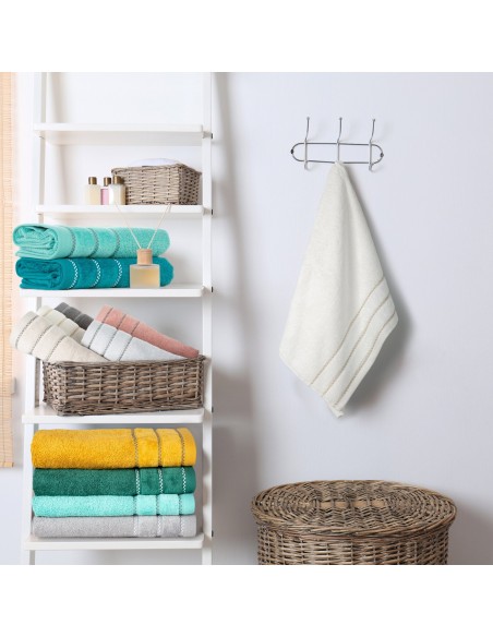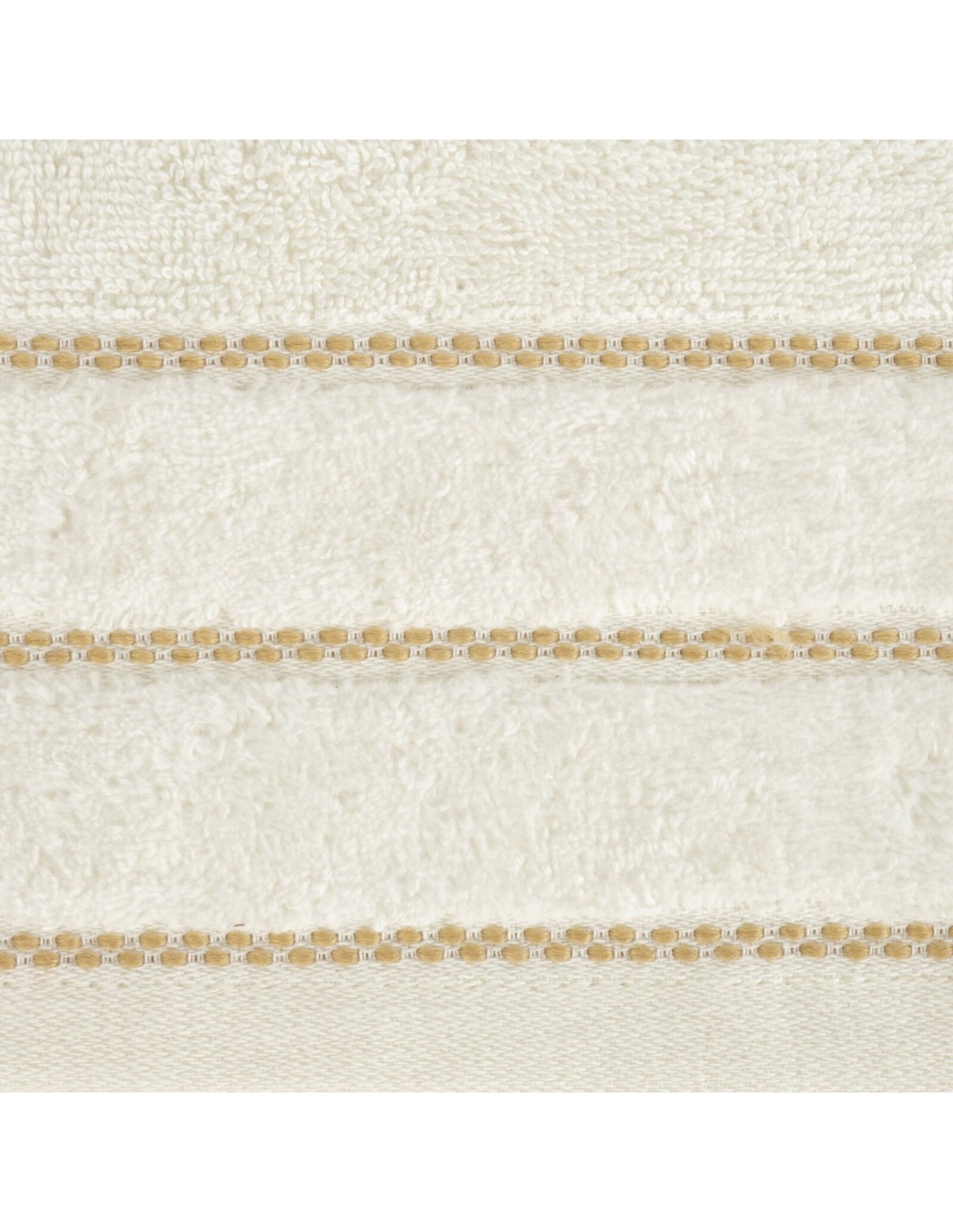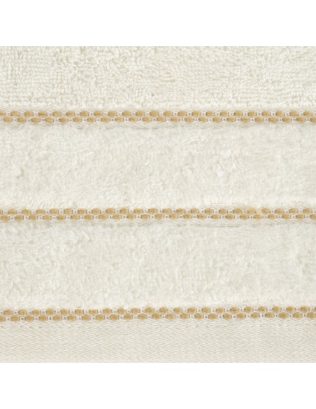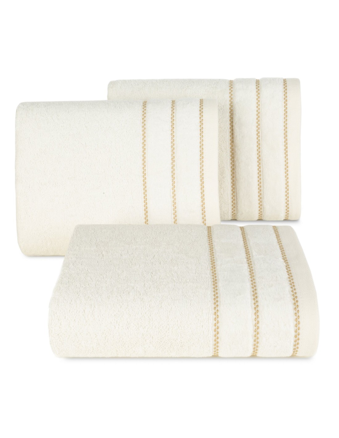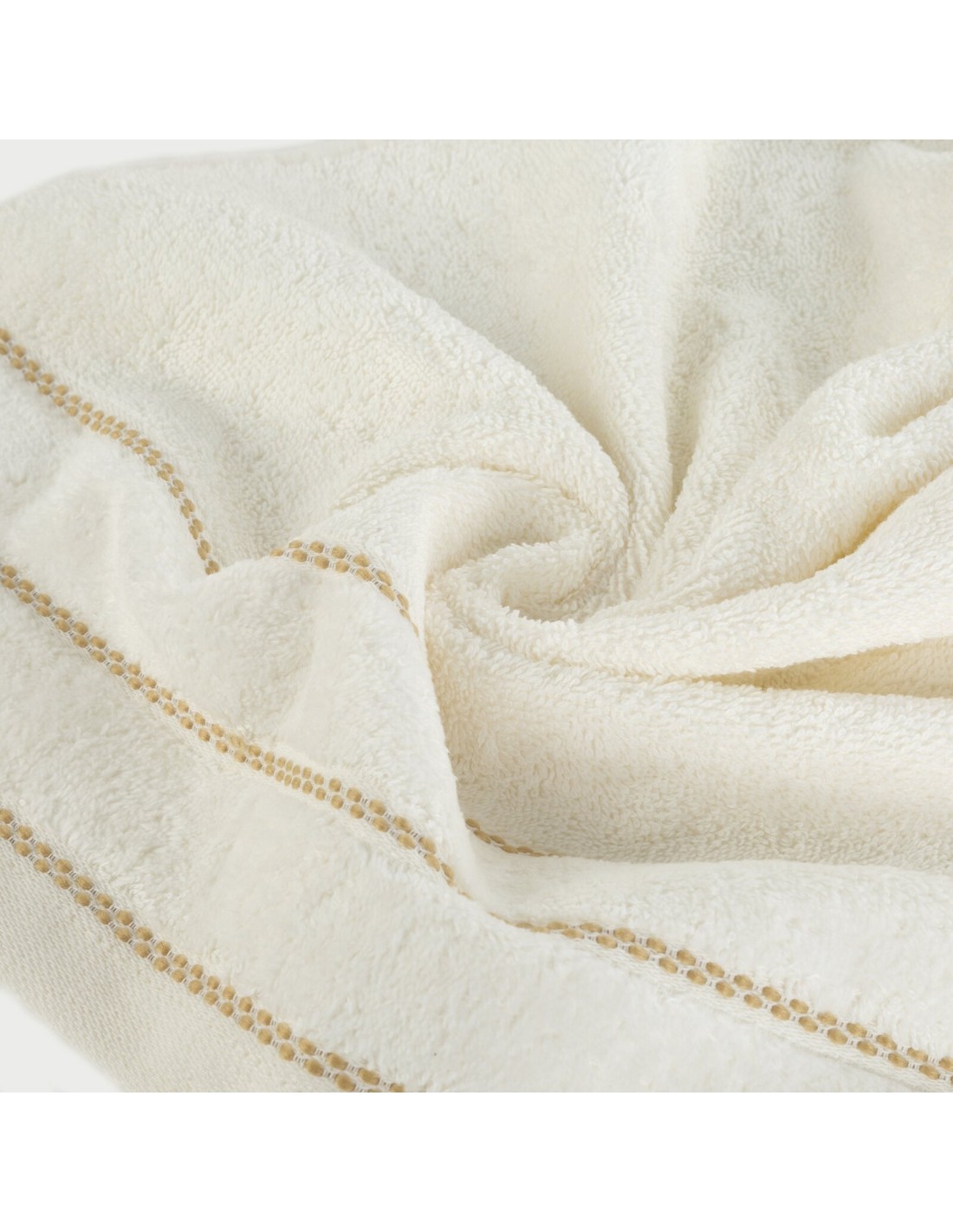 Klasyczny ręcznik kąpielowy z chłonnej tkaniny bawełnianej o splocie frotte. Minimalistyczna bordiura z weluru z dodatkiem lśniącej, metalicznej nici. szerokość: 50 cm, długość: 90 cm, kolor: kremowy, Gramatura: 500 GSM, Skład: 100% bawełna; część ozdobna: 100% poliester