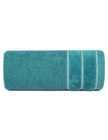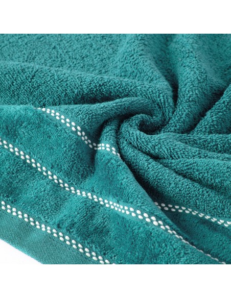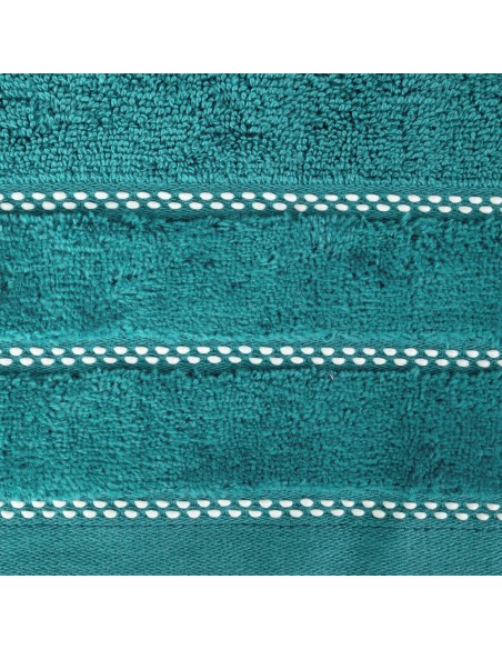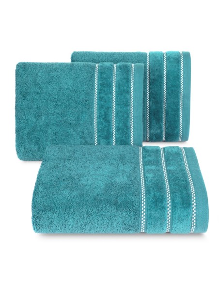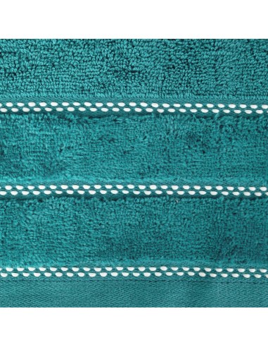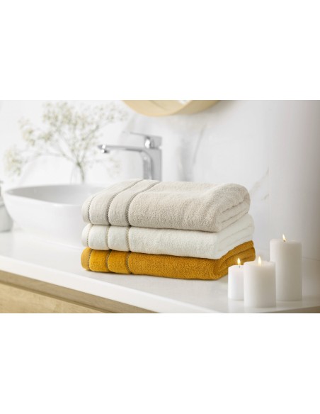 Klasyczny ręcznik kąpielowy z chłonnej tkaniny bawełnianej o splocie frotte. Minimalistyczna bordiura z weluru z dodatkiem lśniącej, metalicznej nici. szerokość: 30 cm, długość: 50 cm, kolor: kremowy, Gramatura: 500 GSM, Skład: 100% bawełna; część ozdobna: 100% poliester