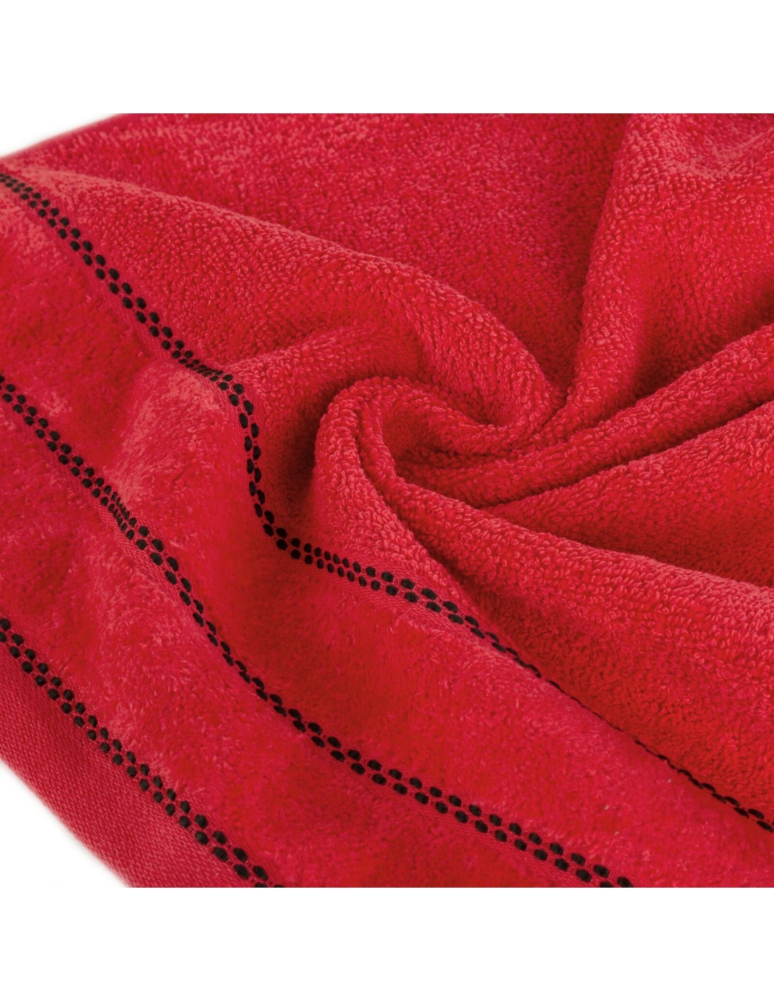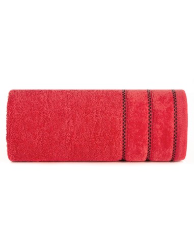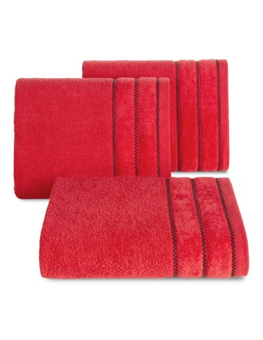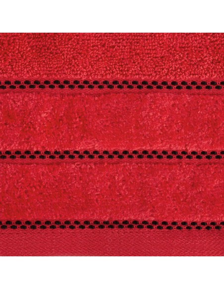 Klasyczny ręcznik kąpielowy z chłonnej tkaniny bawełnianej o splocie frotte. Minimalistyczna bordiura z weluru z dodatkiem lśniącej, metalicznej nici. szerokość: 50 cm, długość: 90 cm, kolor: czerwony, Gramatura: 500 GSM, Skład: 100% bawełna; część ozdobna: 100% poliester