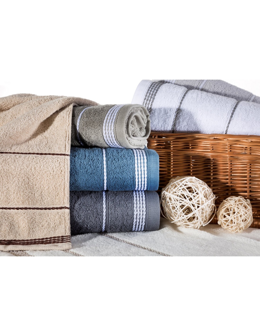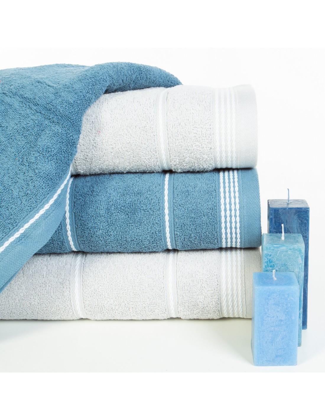 Miękki, klasyczny ręcznik kąpielowy z chłonnej tkaniny bawełnianej frotte zdobiony subtelną, elegancką bordiurą. Jednokolorowy ręcznik nie farbuje. szerokość: 50 cm, długość: 90 cm, kolor: jasnopopielaty, Gramatura: 500 GSM, Skład: 100% bawełna; część ozdobna: 60% bawełna, 40% poliester