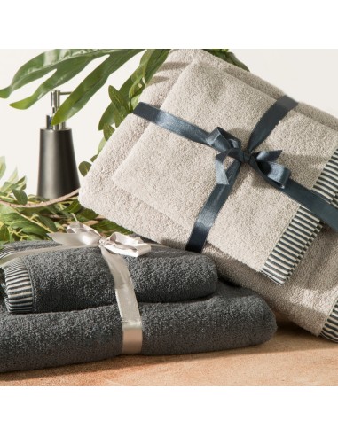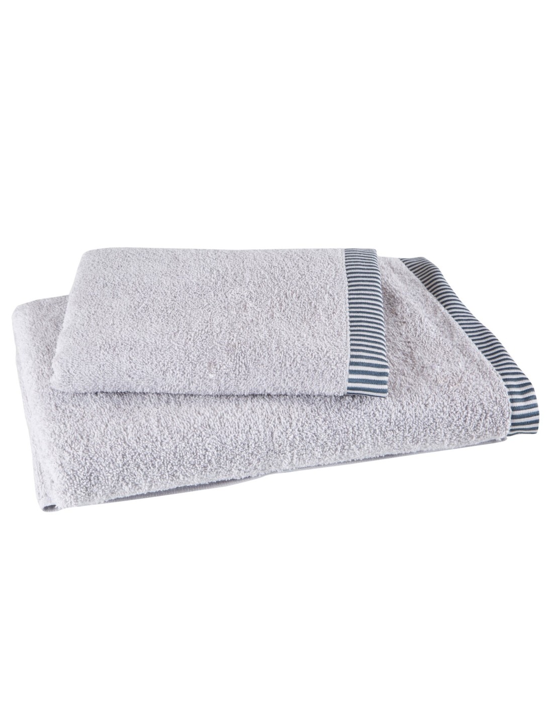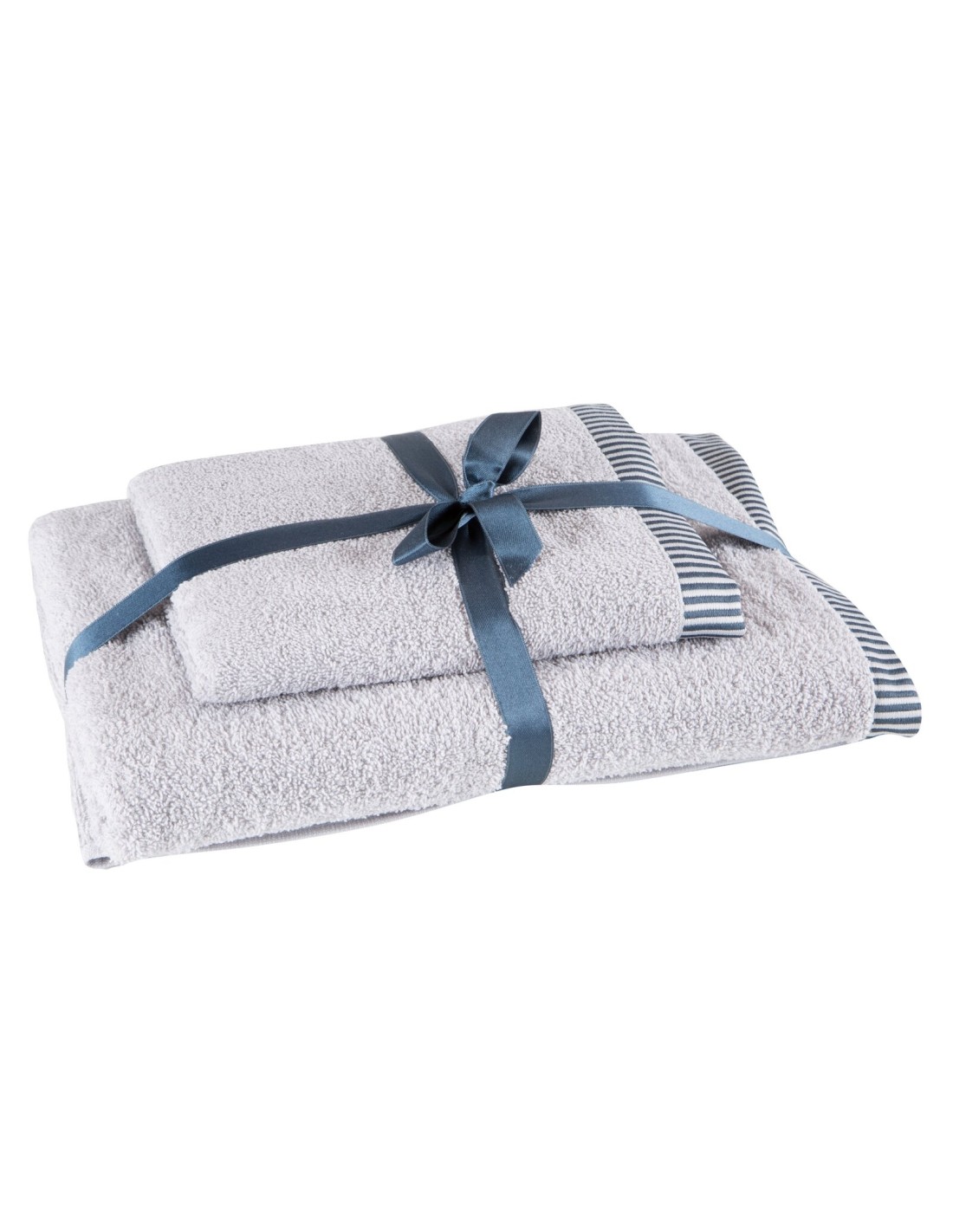 Komplet ręczników z ozdobną bordiurą w paseczki szerokość: 36 cm, długość: 25 cm, kolor: srebrny, Gramatura: 450 GSM, Skład: 100% bawełna; część ozdobna: 95% bawełna, 5% poliester