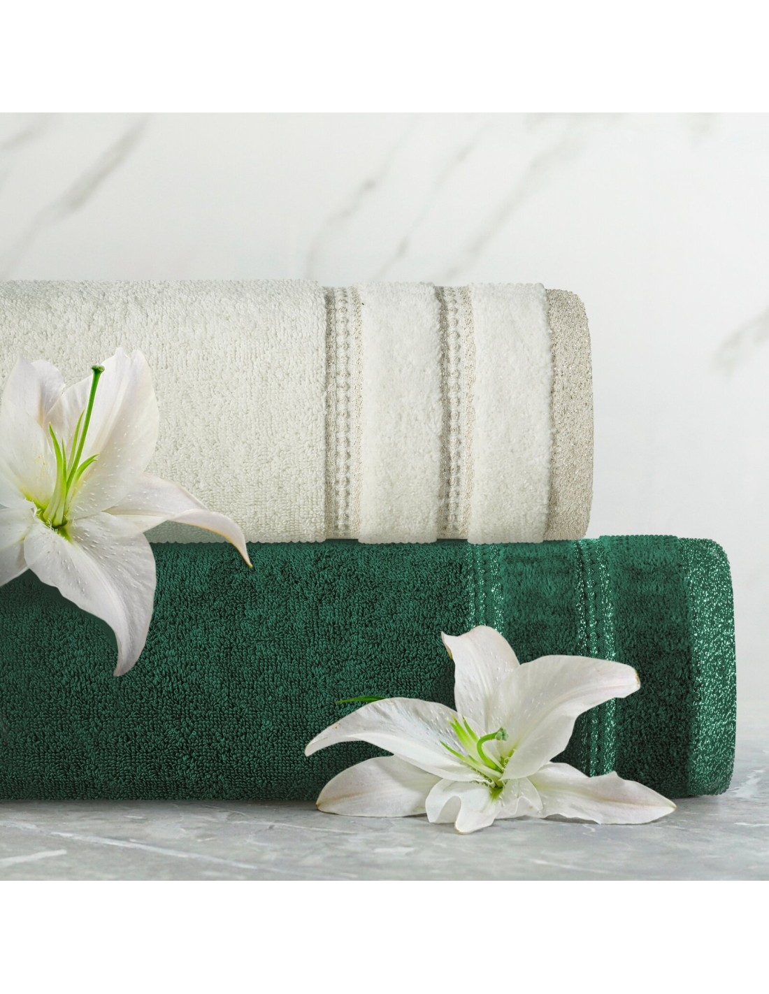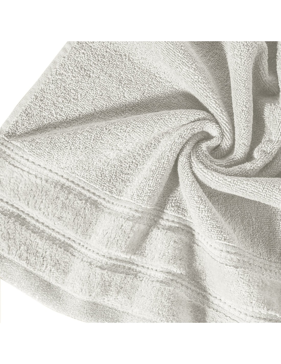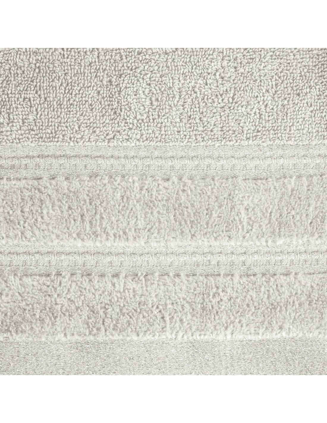 Klasyczny ręcznik kąpielowy z chłonnej tkaniny bawełnianej o splocie frotte. Minimalistyczna bordiura z weluru z dodatkiem lśniącej, metalicznej nici. szerokość: 30 cm, długość: 50 cm, kolor: beżowy, Gramatura: 500 GSM, Skład: 100% bawełna; część ozdobna: 99.2% bawełna, 0.8% nić metaliczna