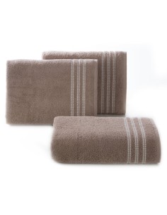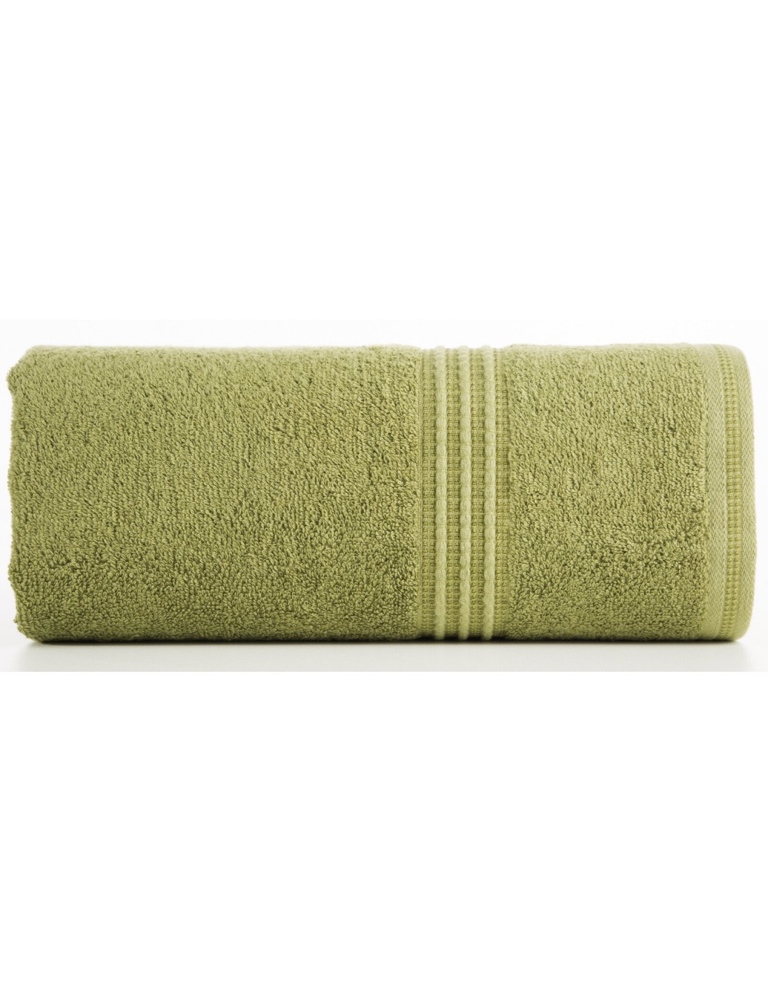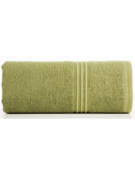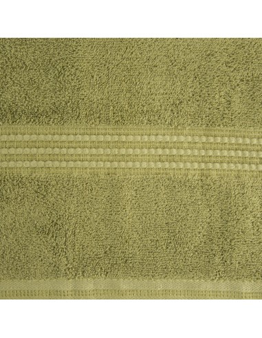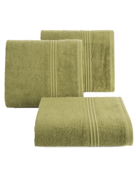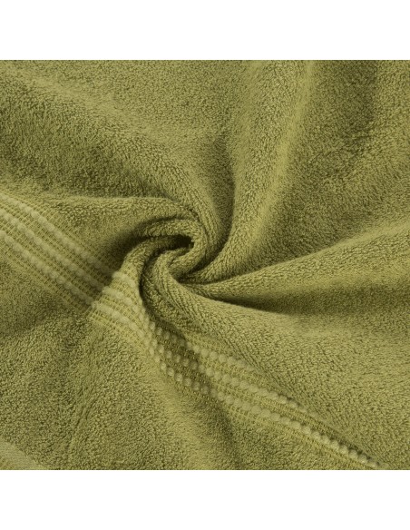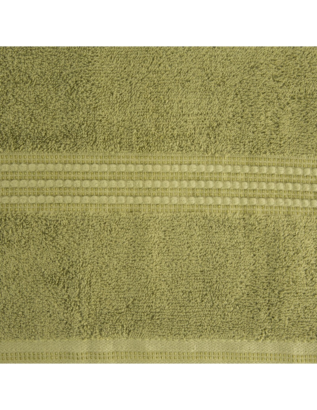 Ręcznik bambusowy z ozdobną bordiurą w pasy szerokość: 50 cm, długość: 90 cm, kolor: oliwkowy, Gramatura: 500 GSM, Skład: 100% wiskoza z włókna bambusowego; część ozdobna: 100% bawełna