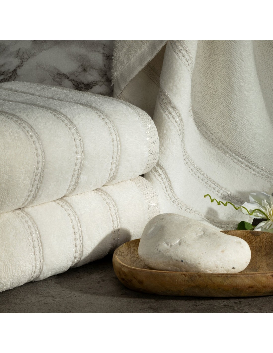Klasyczny ręcznik kąpielowy z chłonnej tkaniny bawełnianej o splocie frotte. Minimalistyczna bordiura z weluru z dodatkiem lśniącej, metalicznej nici. szerokość: 30 cm, długość: 50 cm, kolor: srebrny, Gramatura: 500 GSM, Skład: 100% bawełna, 99.2% bawełna, 0.8% nić metaliczna