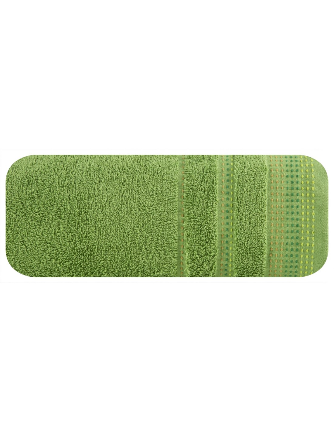 Jednobarwny ręcznik z miękkiej i chłonnej tkaniny bawełnianej o splocie frotte zdobiony kolorową bordiurą w stylu fastrygi. Łatwy w praniu, nie farbuje. szerokość: 30 cm, długość: 50 cm, kolor: zielony, Gramatura: 500 GSM, Skład: 100% bawełna
