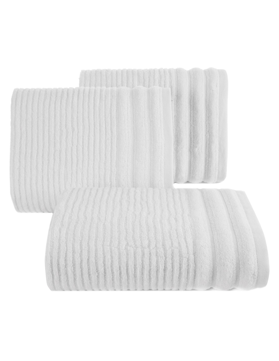 Jednobarwny ręcznik z miękkiej i chłonnej tkaniny bawełnianej o splocie frotte zdobiony kolorową bordiurą w stylu fastrygi. Łatwy w praniu, nie farbuje. szerokość: 70 cm, długość: 140 cm, kolor: biały, Gramatura: 400 GSM, Skład: 100% bawełna